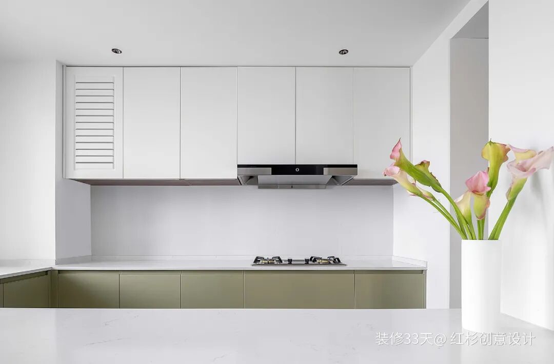 ▲ U型厨房,以白色为主,搭配浅绿色地柜,呈现出干净清爽的烹饪环境