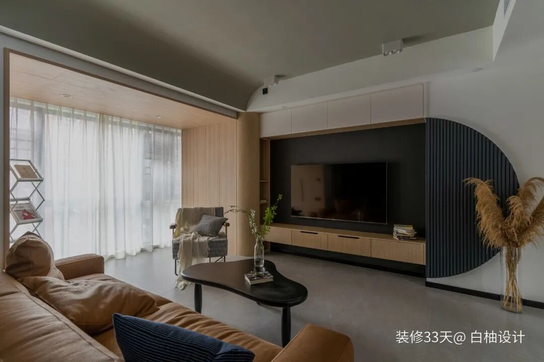 ▲ 黑色电视背景上下都定制了储物柜,右侧墙面做了半圆造型,带来些许趣味性