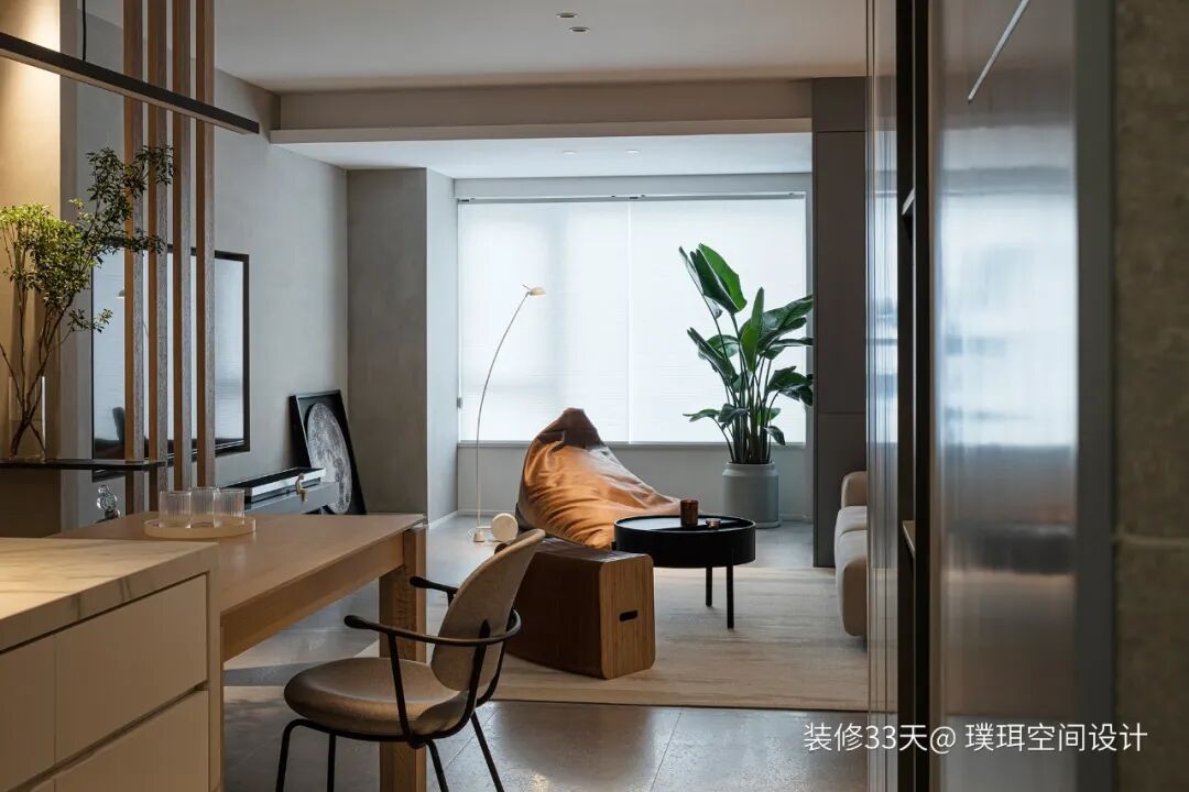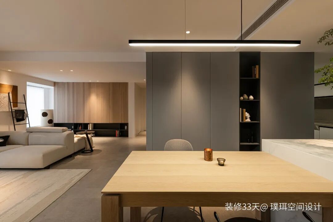 ▲ 木质格栅为餐厅和客厅的分界,同时也作为入户端景缓冲视线