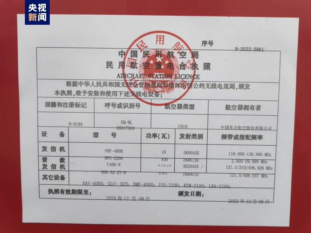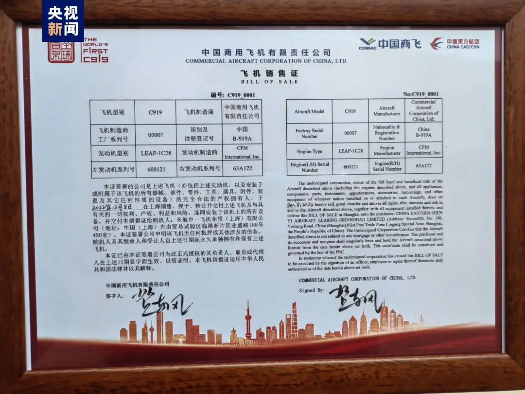 在当天的交付环节,中国商飞向中国东航交付“C919全球首架纪念钥匙”,颁发飞机销售证;民航华东局向中国东航颁发国籍登记证、单机适航证(AC证)、电台执照,中国民航运输市场首次拥有中国自主研发的喷气式干线飞机。