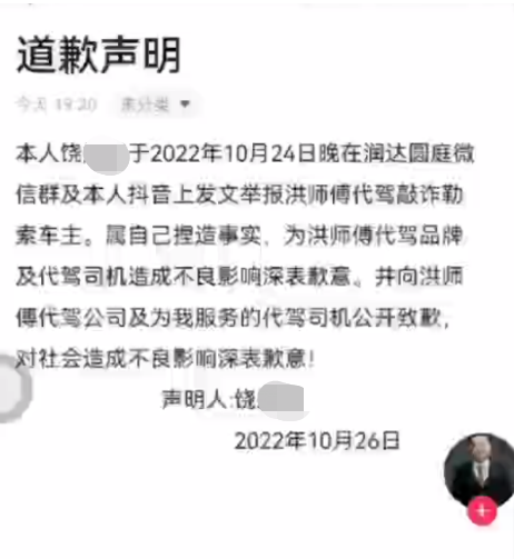 此事引发网友热议,不少网友都开始担心日后面对代驾司机讹诈的问题。10月26日晚,事情出现反转,该车主发布了新的视频,称其此前发文举报代驾敲诈车主一事属捏造事实,向“洪师傅代驾”及司机公开道歉。
