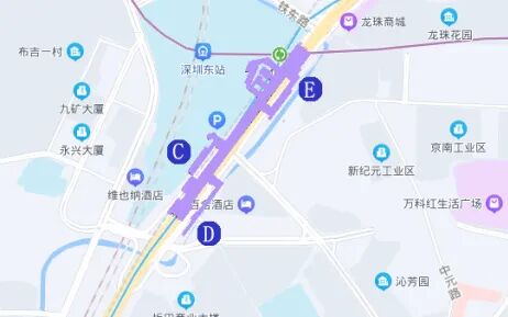 布吉站位于龙岗大道与铁东路交叉路口南侧,沿龙岗大道南北向布置,设置了 3 个出入口(C、D、E)。