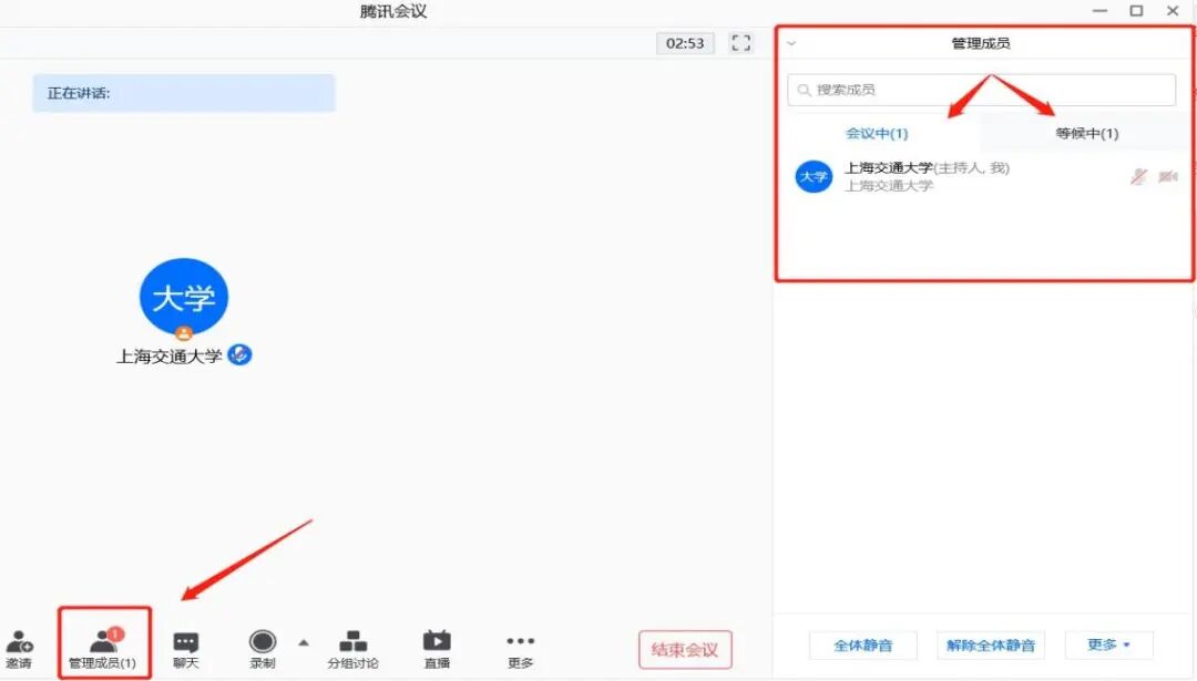 ③PPT展示结束后点击“结束共享”进入评委互动问答环节,请注意此处不是“结束会议”。
