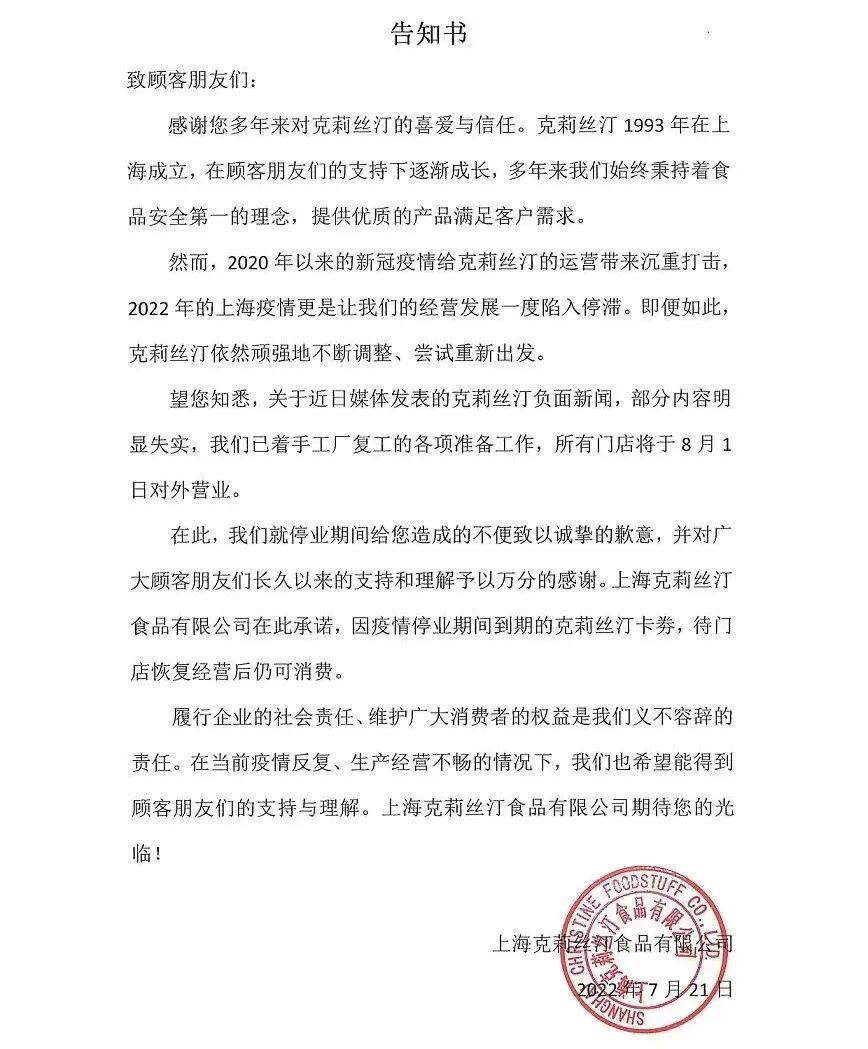 7月22日,上海克莉丝汀食品有限公司发布《告知书》:“2020年以来的新冠疫情给克莉丝汀的运营带来沉重打击,2022年的上海疫情更是让我们的经营发展一度陷入停滞。”