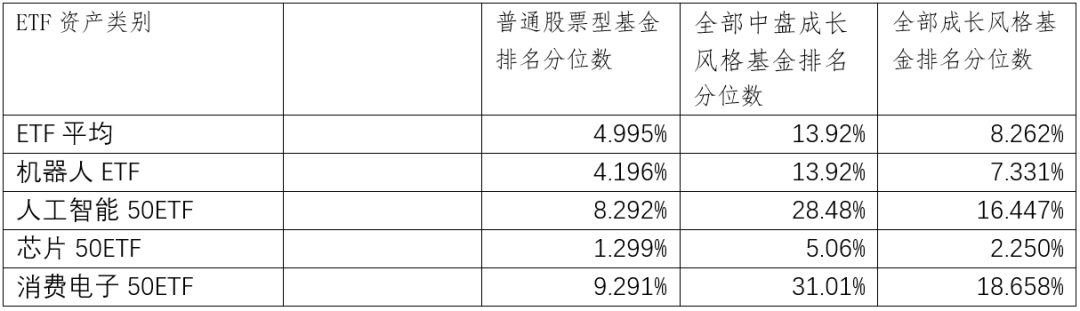 数据来源:WIND,统计截止时间为12月4日。以上参考数据仅为投资者教育之目的使用,不构成任何投资建议或意见,亦不构成任何收益承诺或保证。历史业绩不预示未来表现,市场有风险,投资需谨慎。表中ETF的业绩在普通股票型基金、中盘成长风格基金以及全部成长风格基金的业绩排名分位数都在前1/3,部分还在前5%。