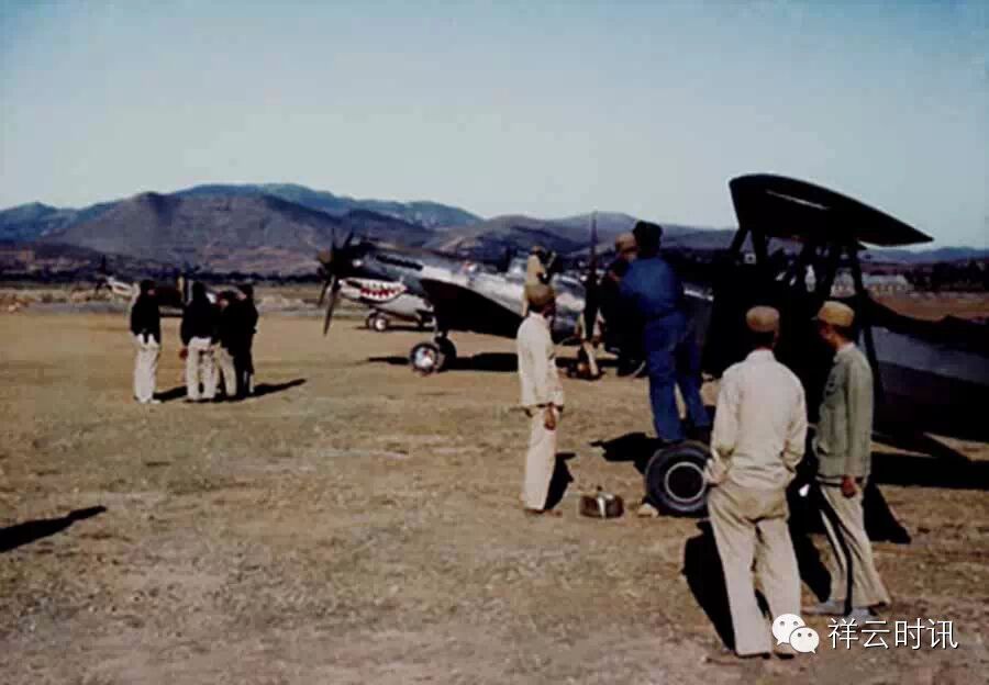 美国飞虎队初到云南驿机场之时的拍照,图中一边停放着的是当时中央空军军官学校初级班的霍克3双机翼飞机,一边是美国新式鲨鱼头P-40战机,一边是中国的机械师,一边是美国的飞行员,后面是高高的象山。