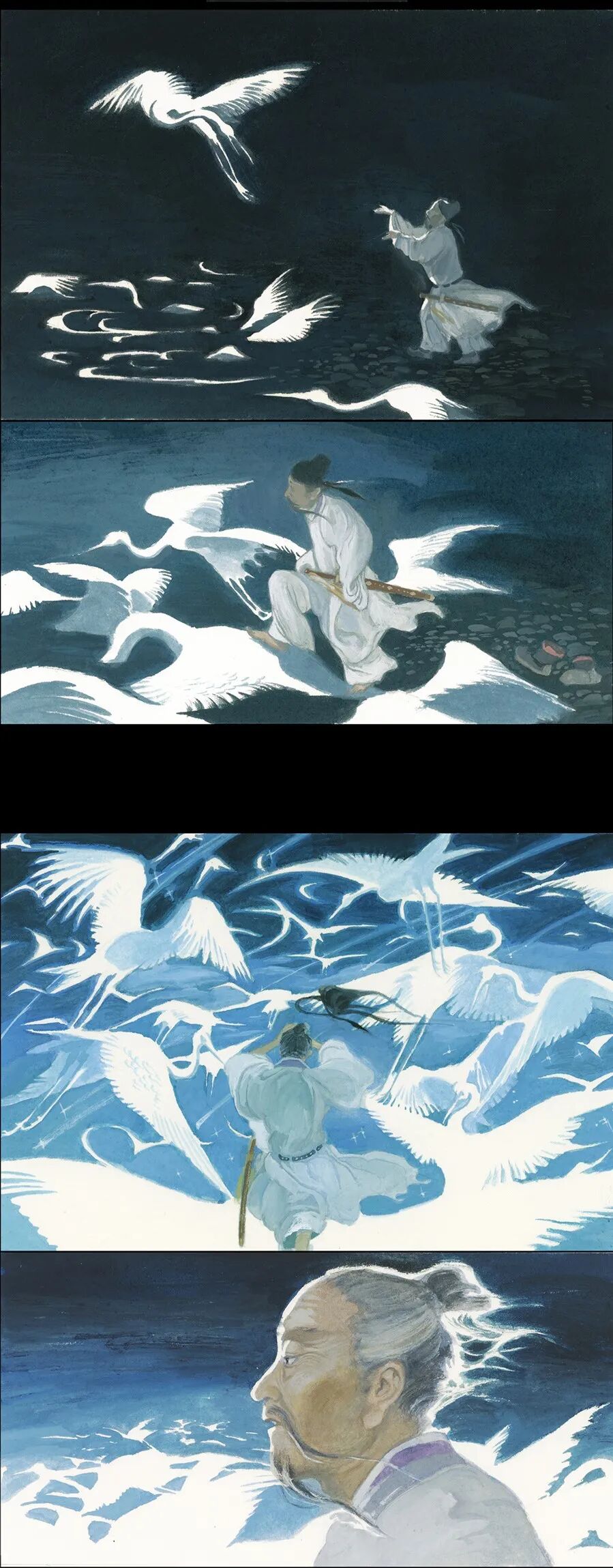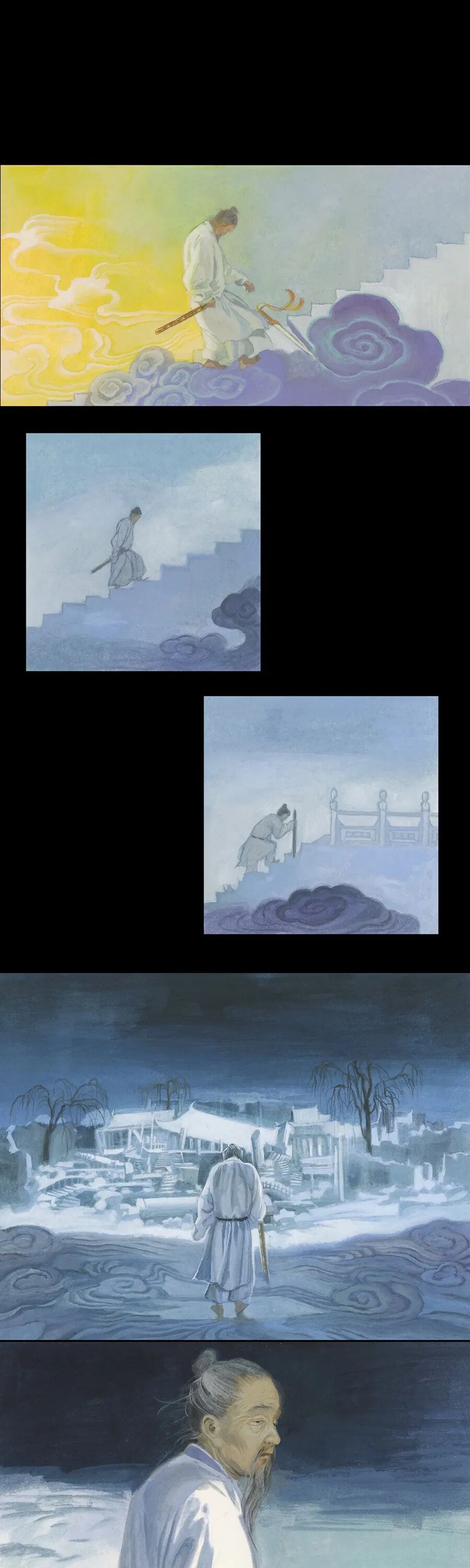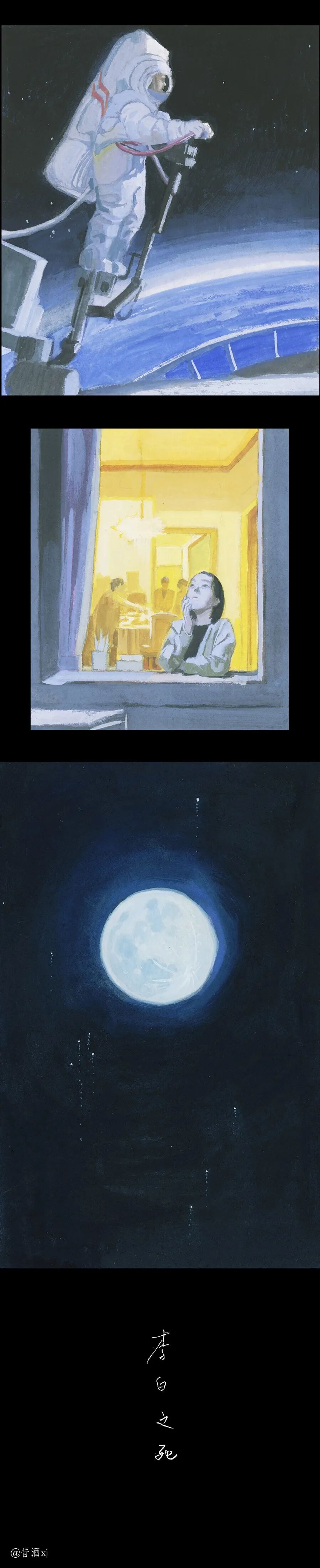 “天生我材必有用”,“长风破浪会有时,直挂云帆济沧海。”...其实咸鱼强内心对这些诗句,信得真切,不然,他怎么会背负上生计之苦,教几个不成器的少年?于是,这则冲上热搜的绘本《李白之死》,让我们许多人共情落泪。也许,这绘本可拿出来和大家分享,让我们在匆忙的现代社会中,感受来自千年前的触动。“诗无盛唐,不足以成一国之艺;盛唐无李白,不足以窥透何为天才。”该作品以李白人生最后时刻脑海中的“回马灯”为主线,描绘出了李白狂妄浪漫,却又悲苦雄壮的形象。场景背后藏着的诗赋,随着情节的推进,在脑海里不断涌现。绘本的背景是一则极具浪漫主义色彩的传说——李白醉酒捞月而溺亡。在死前的走马灯中,李白回顾了自己的一生,好友散去,仕途毁损,他只能扔掉利剑,扔掉杯盏,只留一把剑鞘作为拐杖,在黑夜踽踽独行。最后,李白慢慢登上云梯,看见的月宫是颓圮的城墙。忽然他回身一望,仿佛与所有人有了心灵链接。“今人不见古时月,今月曾经照古人”,上下五千年,我们看到的是同样的明月,同样的浪漫,同样的瑰丽想象。![]()