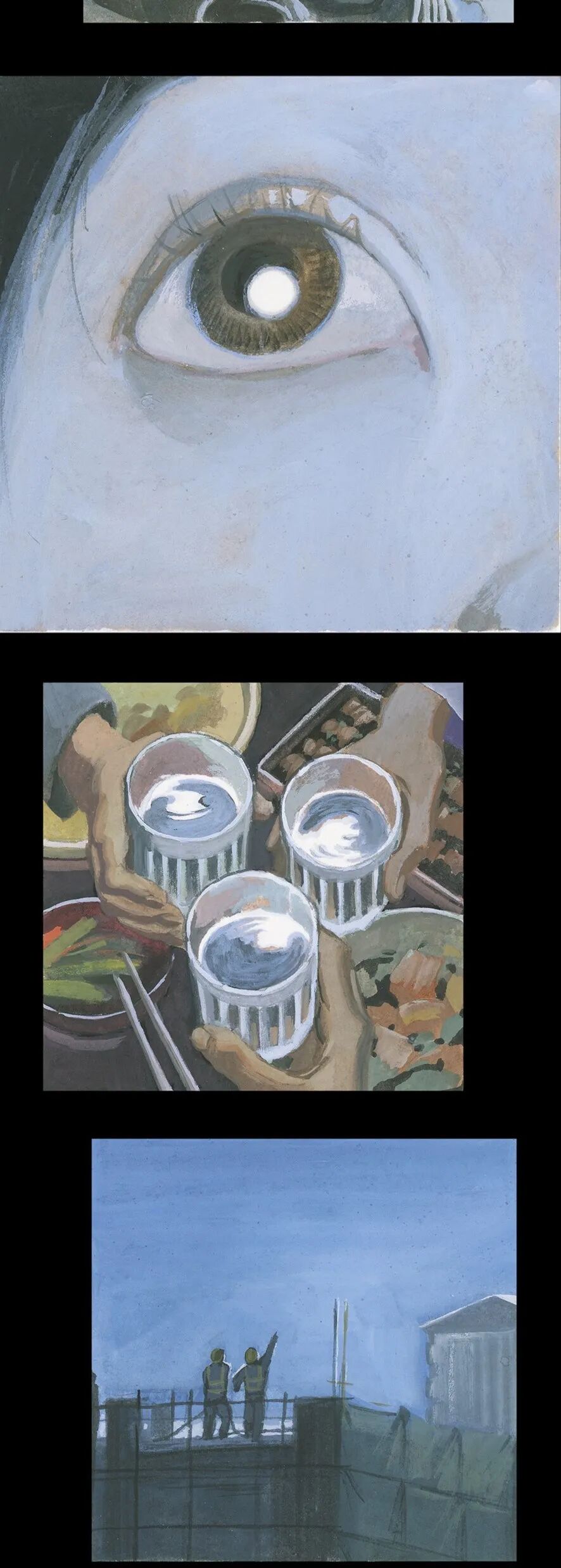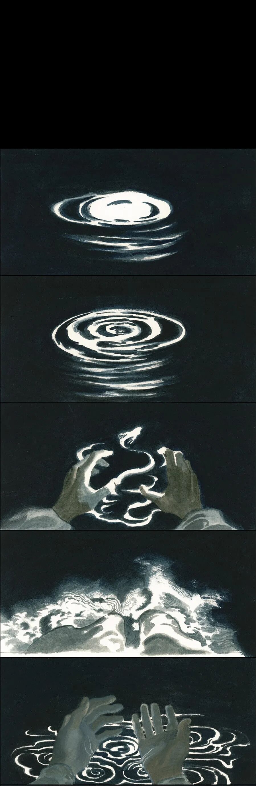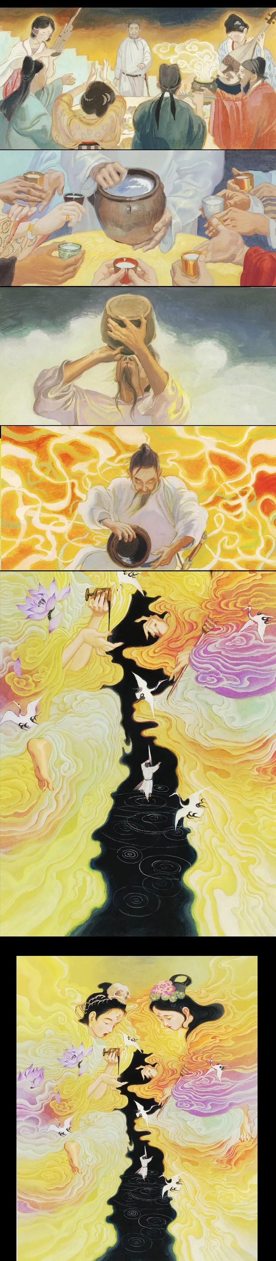 “天生我材必有用”,“长风破浪会有时,直挂云帆济沧海。”...其实咸鱼强内心对这些诗句,信得真切,不然,他怎么会背负上生计之苦,教几个不成器的少年?于是,这则冲上热搜的绘本《李白之死》,让我们许多人共情落泪。也许,这绘本可拿出来和大家分享,让我们在匆忙的现代社会中,感受来自千年前的触动。“诗无盛唐,不足以成一国之艺;盛唐无李白,不足以窥透何为天才。”该作品以李白人生最后时刻脑海中的“回马灯”为主线,描绘出了李白狂妄浪漫,却又悲苦雄壮的形象。场景背后藏着的诗赋,随着情节的推进,在脑海里不断涌现。绘本的背景是一则极具浪漫主义色彩的传说——李白醉酒捞月而溺亡。在死前的走马灯中,李白回顾了自己的一生,好友散去,仕途毁损,他只能扔掉利剑,扔掉杯盏,只留一把剑鞘作为拐杖,在黑夜踽踽独行。最后,李白慢慢登上云梯,看见的月宫是颓圮的城墙。忽然他回身一望,仿佛与所有人有了心灵链接。“今人不见古时月,今月曾经照古人”,上下五千年,我们看到的是同样的明月,同样的浪漫,同样的瑰丽想象。![]()