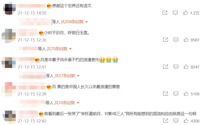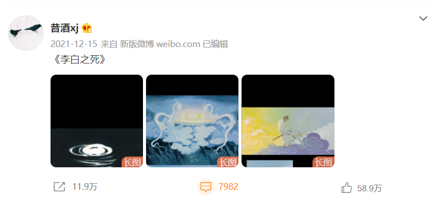 你看,《李白之死》绘本刚出的时候,立即就在微博上登上热搜第一,而且群众评论十分动情。他们也是有了共鸣,跨越时空,相同的孤寂,相同的梦想,被同一轮明月见证。不然,那句烂大街的“长风破浪会有时,直挂云帆济沧海”, 为什么我们大声念出来的时候,依然会觉得热血沸腾呢? 这种对李白千百年来一脉相承的情愫,也存在于许多文艺作品中。比如《妖猫传》里,陈凯歌为我们奉献了一个极为生动的李白形象。面对这繁华之景,空有抱负的李白,悲从中来,无处诉说,化作与诗句共同流淌的眼泪。还有,李荣浩的歌《如果能重来》一句“要是能重来,我要选李白”,用流行的方式寄托世人对李白的向往。如今,李白的IP不该止于此,李白的精神也不该止于此。我想,在动画上我们也应该有这样的觉悟,背负着一些沉重的浪漫,去开拓,去进取,去用更丰富的动画弘扬传统IP,去跨越时空与李白来一场对话。