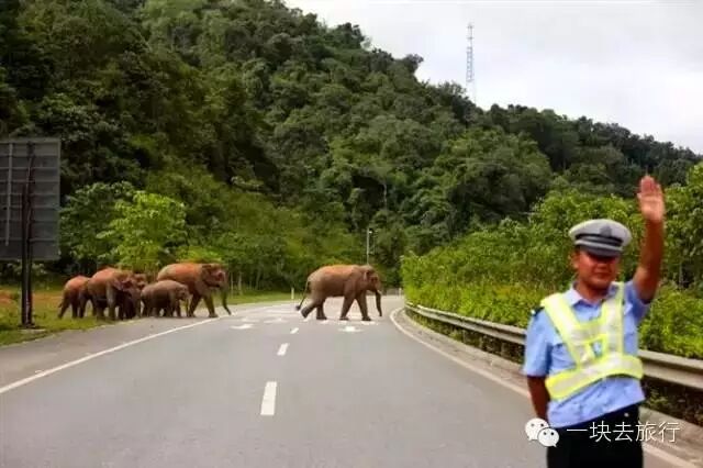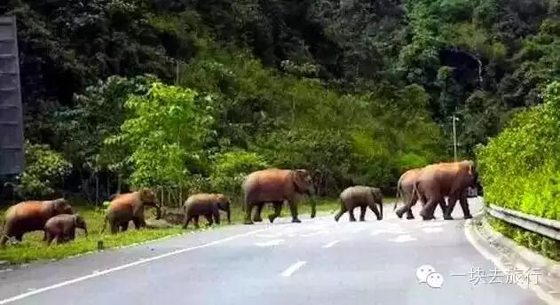 在公路上,偶然还会看到结伴出游的野象仔们~ 瞬间让人感觉来到了热带雨林的童话世界。