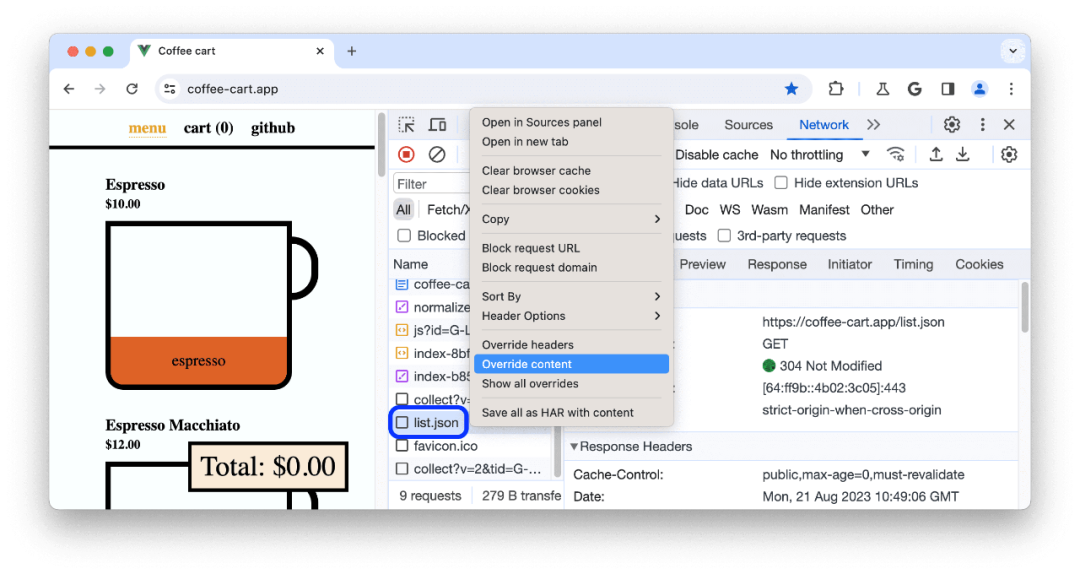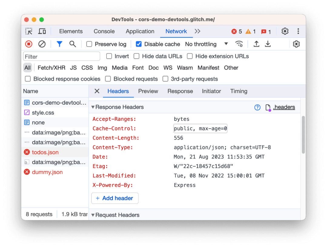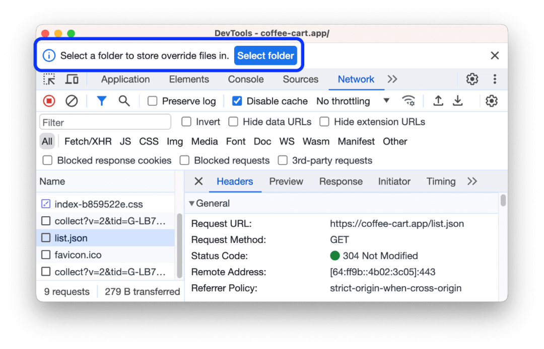 转到网络,找到相应请求,右键点击该请求,然后选择替换响应头。开发者工具会带您进入 Headers > Response Headers 编辑器。
