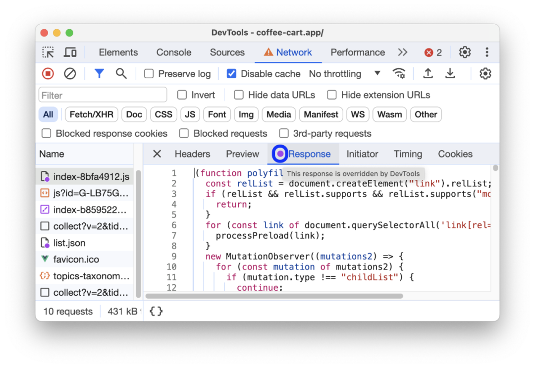 此外,对于包含已覆盖 Web 内容的请求的响应标签页,网络面板上会显示一个紫色圆点图标,并且旁边有一个提示。
