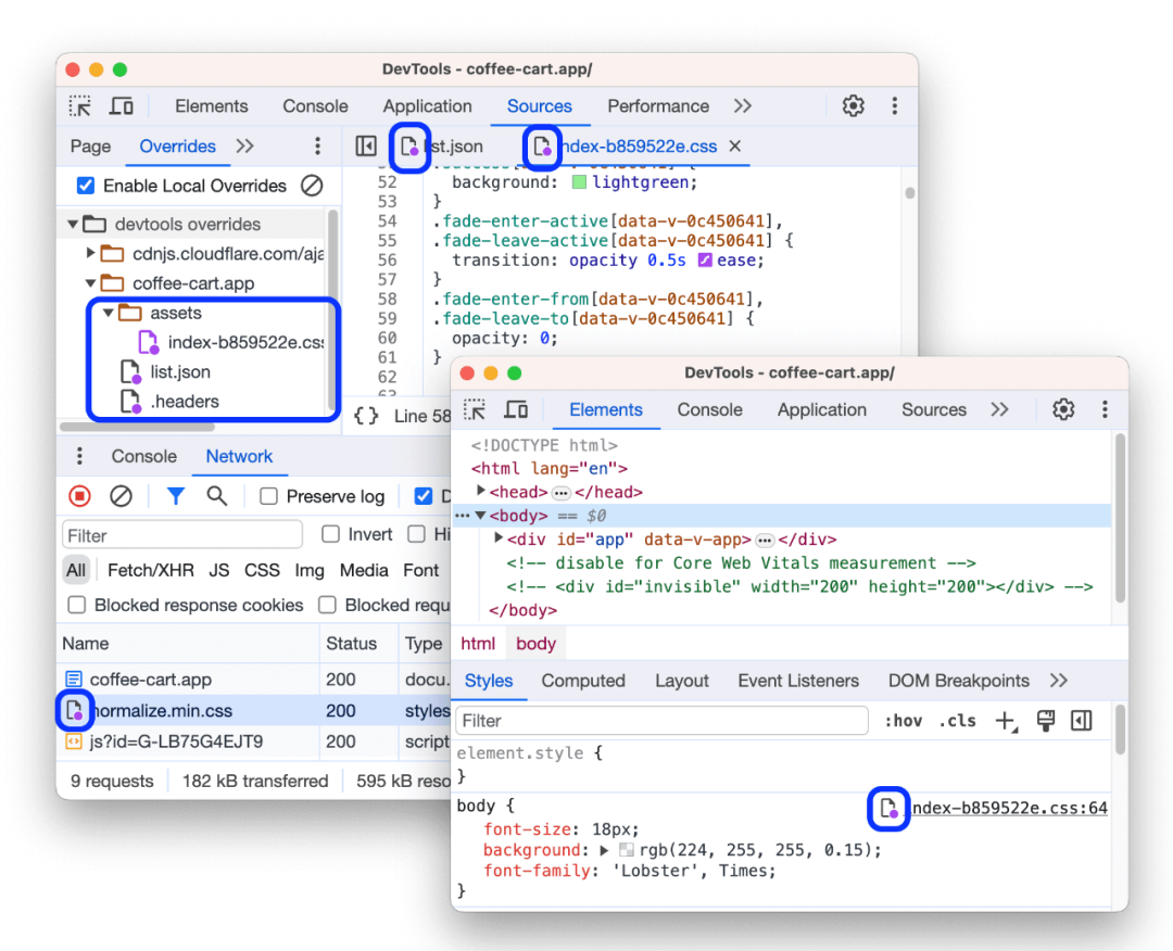 您可以修改来源中的文件,开发者工具会保存修改后的文件,在来源 > 替换中列出它们,并会在相关面板和窗口格中被替换的文件旁边显示 已保存图标: