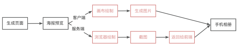 而在程序内部,还需要开发者做一些其他工作。这里的客户端包含原生和前端,两者在实现原理上类似——首先用画布绘制海报,然后将海报转成图片。在服务端,常用的方案是开启一个无头浏览器,先在浏览器上渲染出海报,然后截图生成图片,将生成的图片下发给前端。