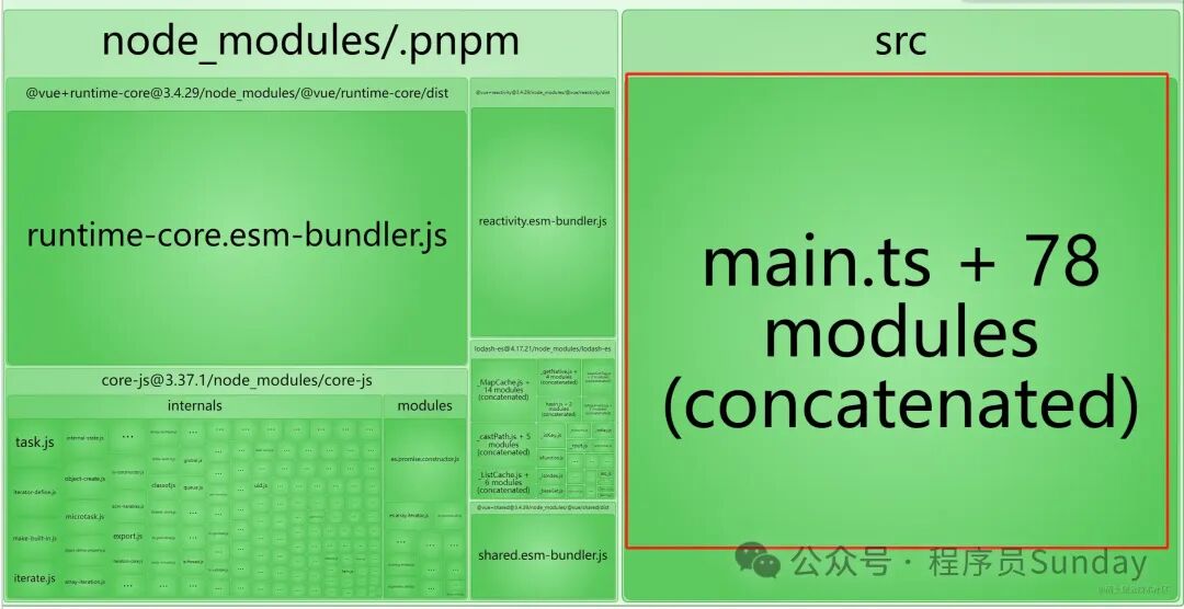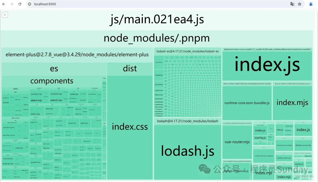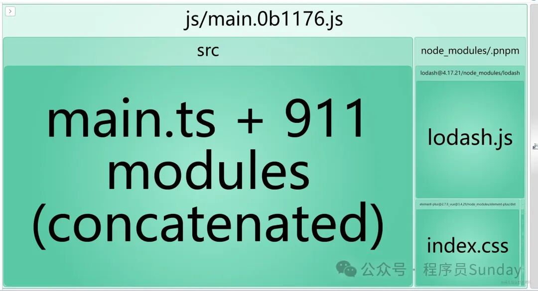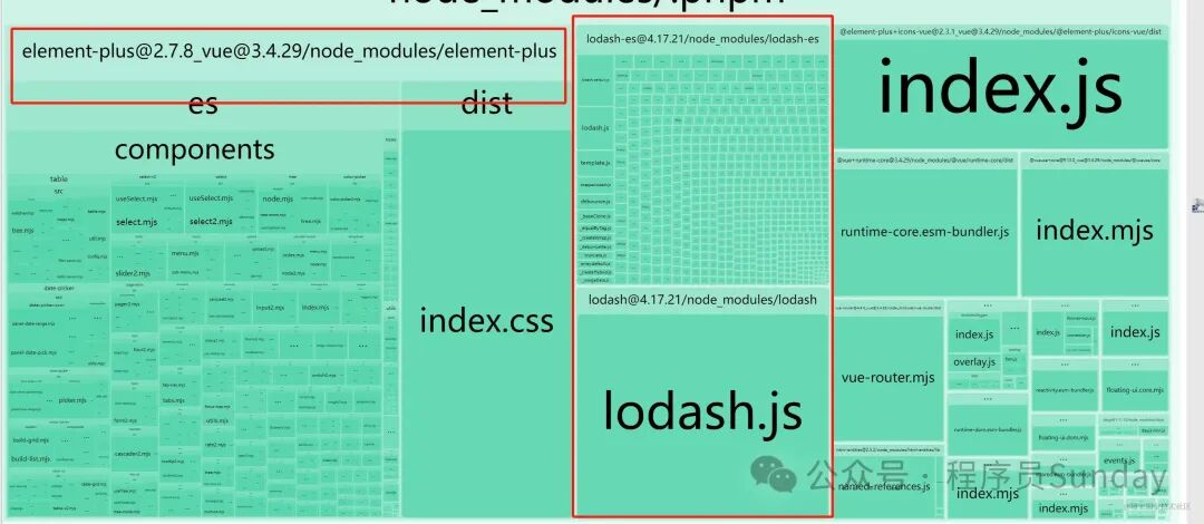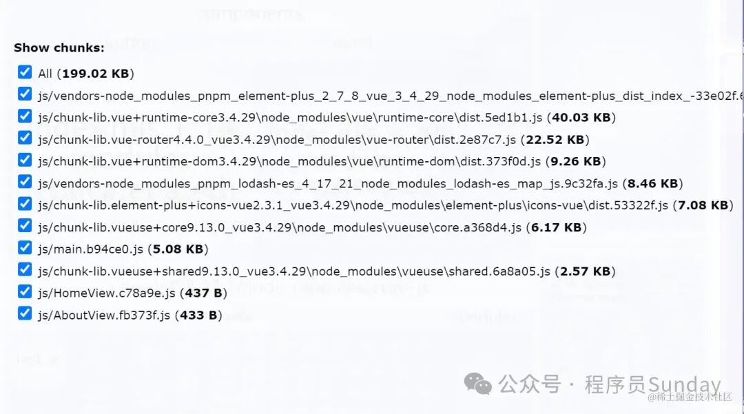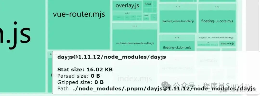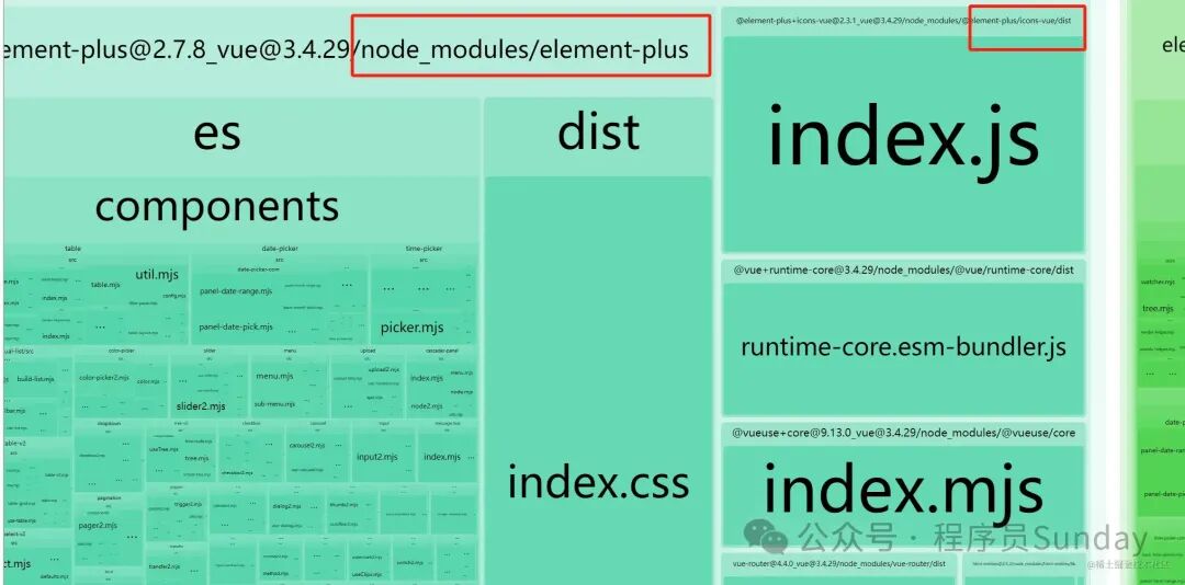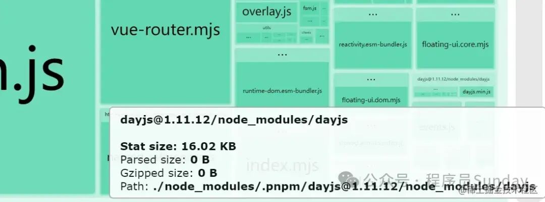 向 day.js 这些第一次打包的时候存在的第三方模块,为什么现在打包结果中不存了呢?其实很简单,因为 day.js 这个第三方模块是 element-plus组件中的时间日历组件导入使用的模块,但是因为我们目前是按需加载的 element 组件库,而我们目前项目中没有依赖时间日历组件,所以自然这些模块都被依次 tree sheaking 掉了。