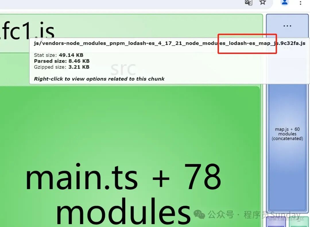 第三方库里面的异步导入的模块也被打包成了一个单独的模块。其实目前主要就是包含了 lodash-es map 模块的相关内容。这就说明 lodash 里面的 map 函数存在依赖了一些异步加载的模块。如果我们在项目中去除掉lodash map 函数,替换为一个其他的模块: