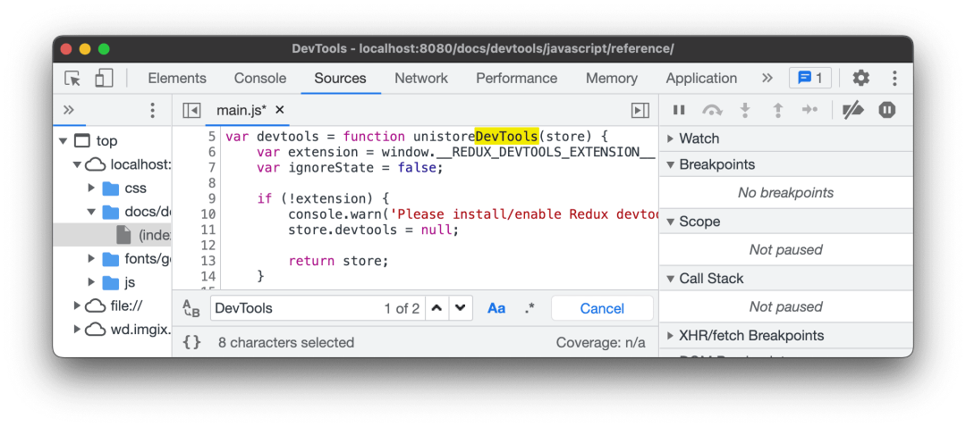 1、 在 Sources 面板的 Editor 窗格中打开文件。2、 若要打开内置搜索栏,请按 Command+F (Mac) 或 Ctrl+F(Windows、Linux)。3、 在栏中输入您的查询内容。
