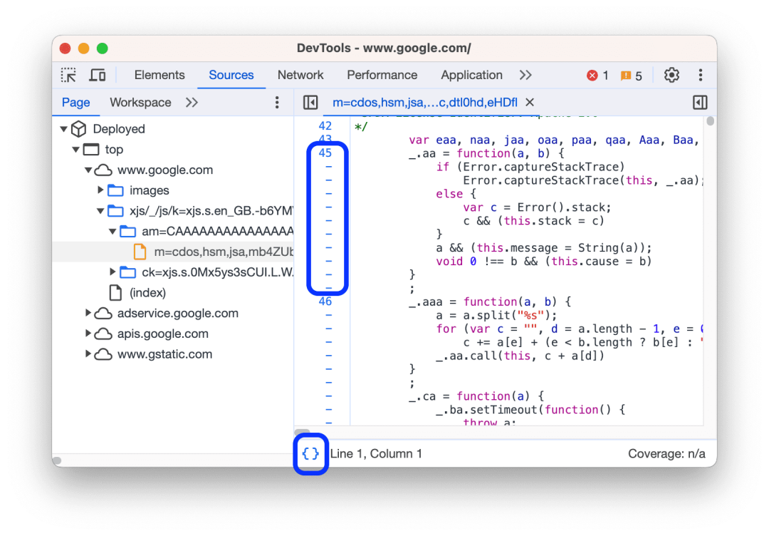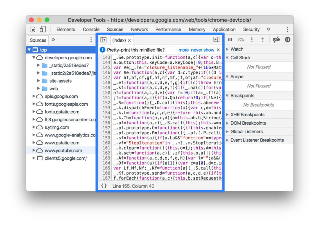 默认情况下,Sources 面板会美观输出缩减大小的文件。经过整齐输出后,编辑器可能会以多行显示单个长代码行,使用 - 指示它是行的延续。