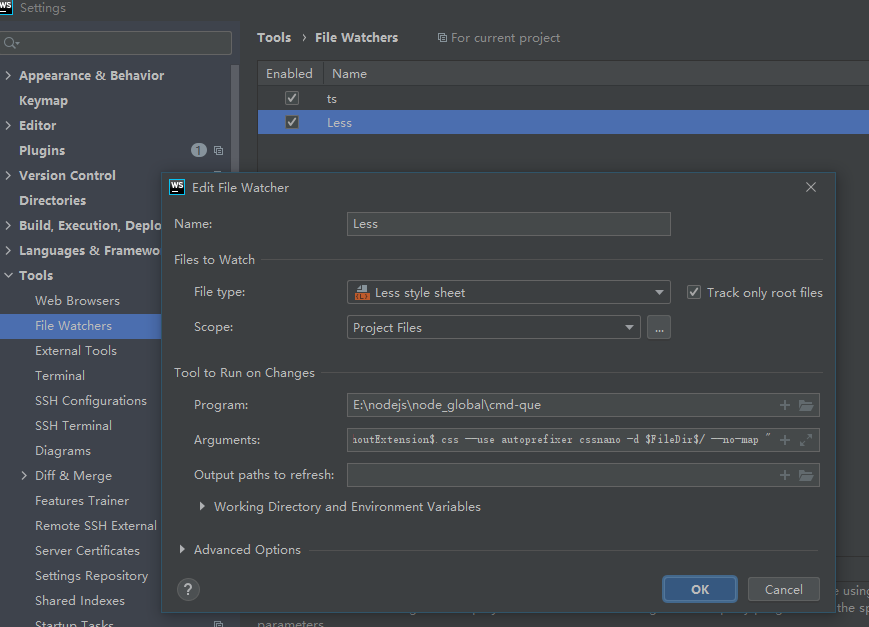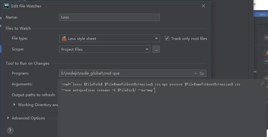 那么有没有办法不用手动输入命令行呢?如果只是为了不手动输入的话,那么可以在vscode上安装compile hero插件,或者在webstorm上开启file watch功能。可惜的是这些工具或功能只能对当前文件做处理,处理编译后的文件又要手动去执行命令,不能连续监听或监听一次执行多个命令,比如webstorm的file watch监听了sass文件变化, 那么它不能再监听css变化去压缩代码,否则会无限编译下去。