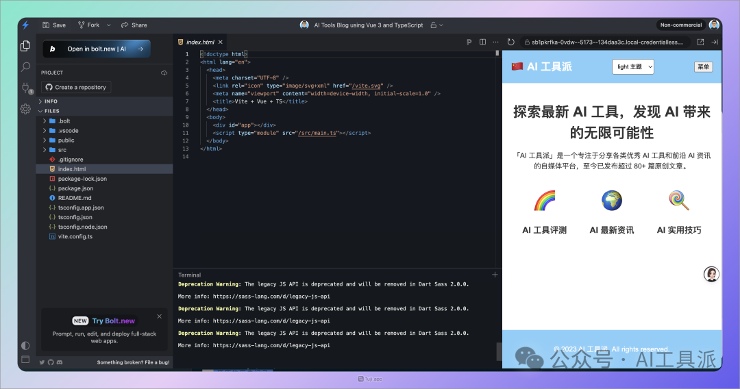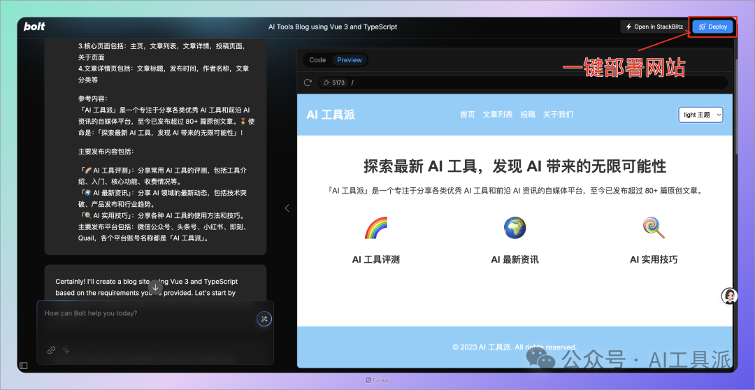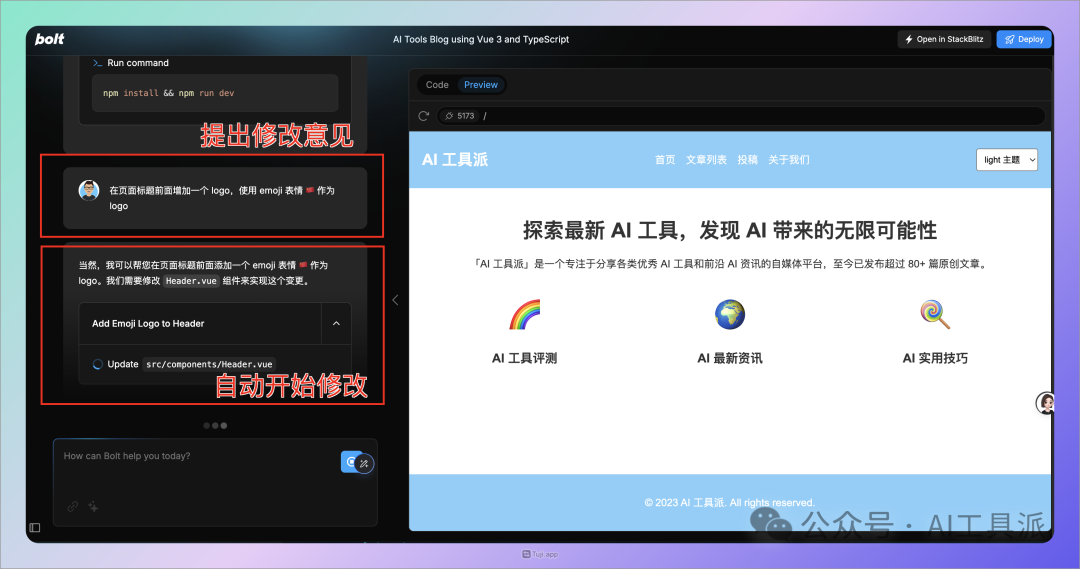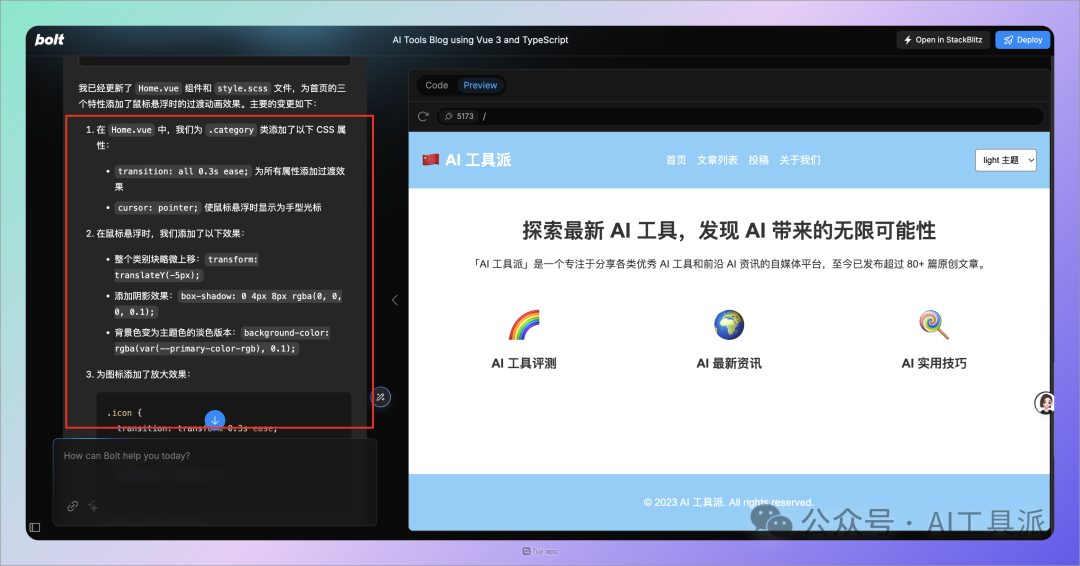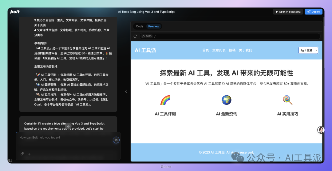 等待 Bolt 创建所有代码后,即可在右侧预览网页效果,还可以在左侧输入框中,通过提示词让 Bolt 对网页进行修改。