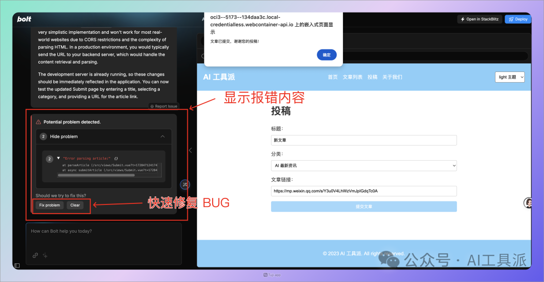 在项目运行过程中,如果出现 Bug,也可以让 Bolt 自行修改即可。