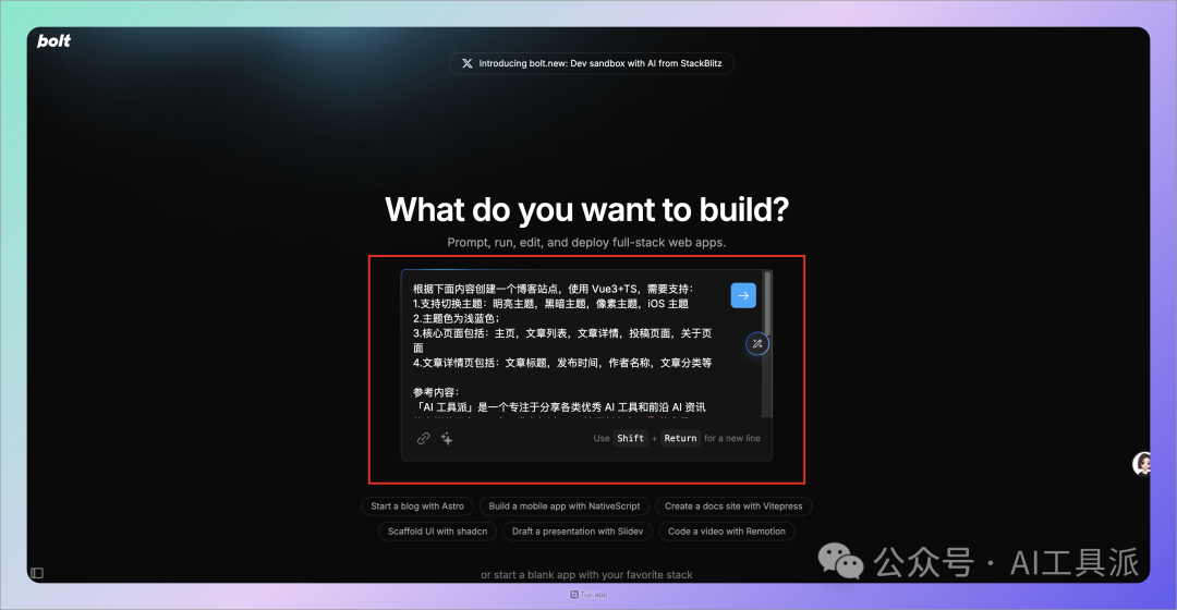 登录 Bolt 后,在首页输入框中,输入提示词,描述需要制作的网页大概信息,比如 Chris 想做一个博客,提示词如下: