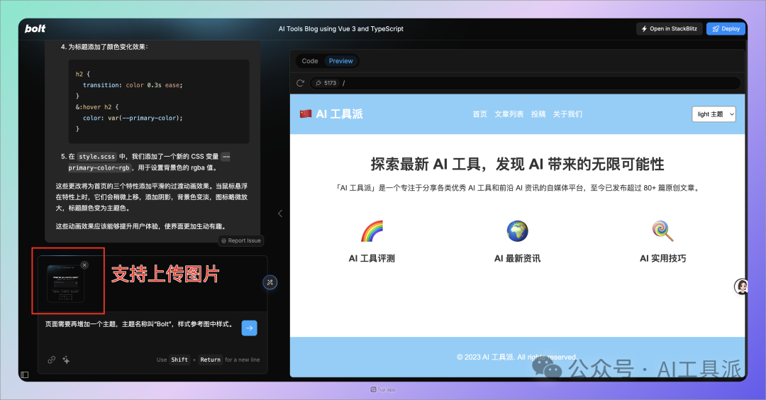 Bolt 还支持在对话框中上传附件(如图片等),作为对话上下文,这样就可以直接把 UI 设计稿直接上传给 Bolt 实现,非常方便 😄