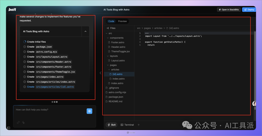 Bolt 跟其他 AI 编程工具一样,会把生成的代码进行详细介绍,对于开发人员来说,非常直观,好理解:
