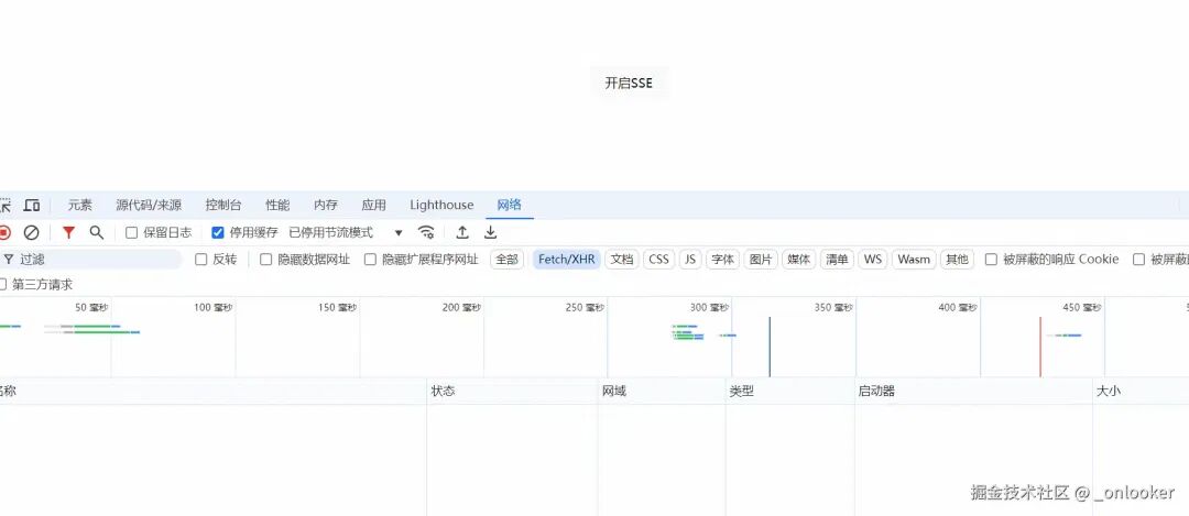 这里我们简单实现了一个node服务,主要的就是Content-Type这里我们把他设置为了text/event-stream,也就是服务端的消息推送,然后我们每100毫秒推送一个字符过去,然后我们再前台看一下接收的效果是什么样子的