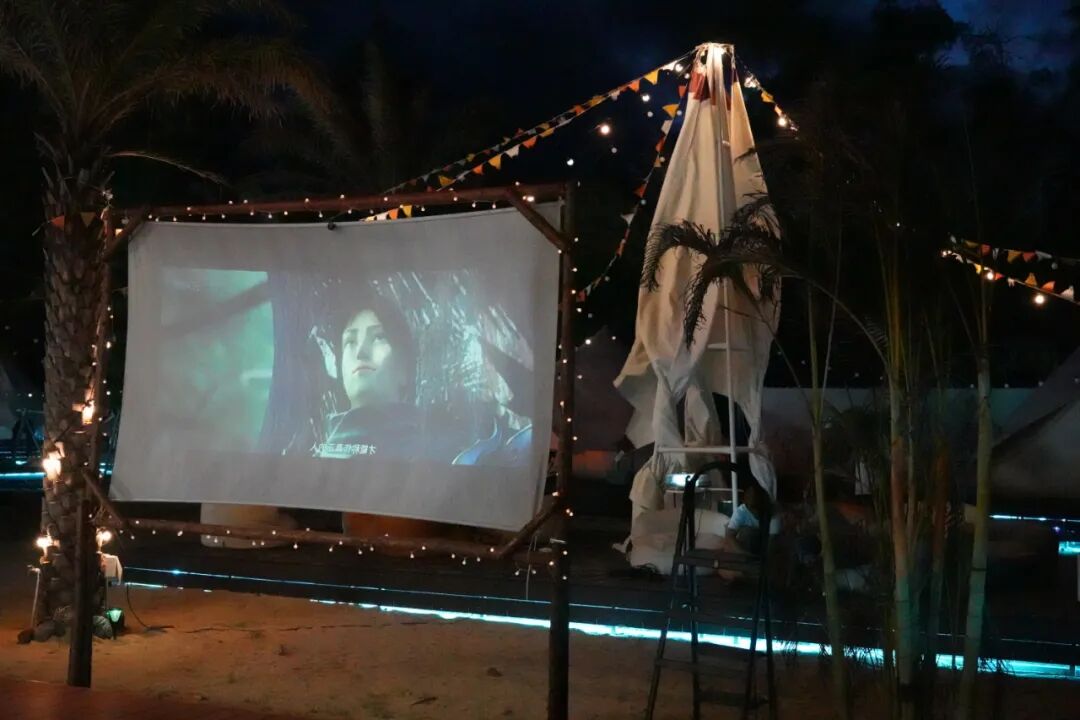 A film shows at Tracy Yeung's camping resort at Xichong Beach in Dapeng New Area. Lin Songtao 杨翠儿开的露营地正在放映电影。