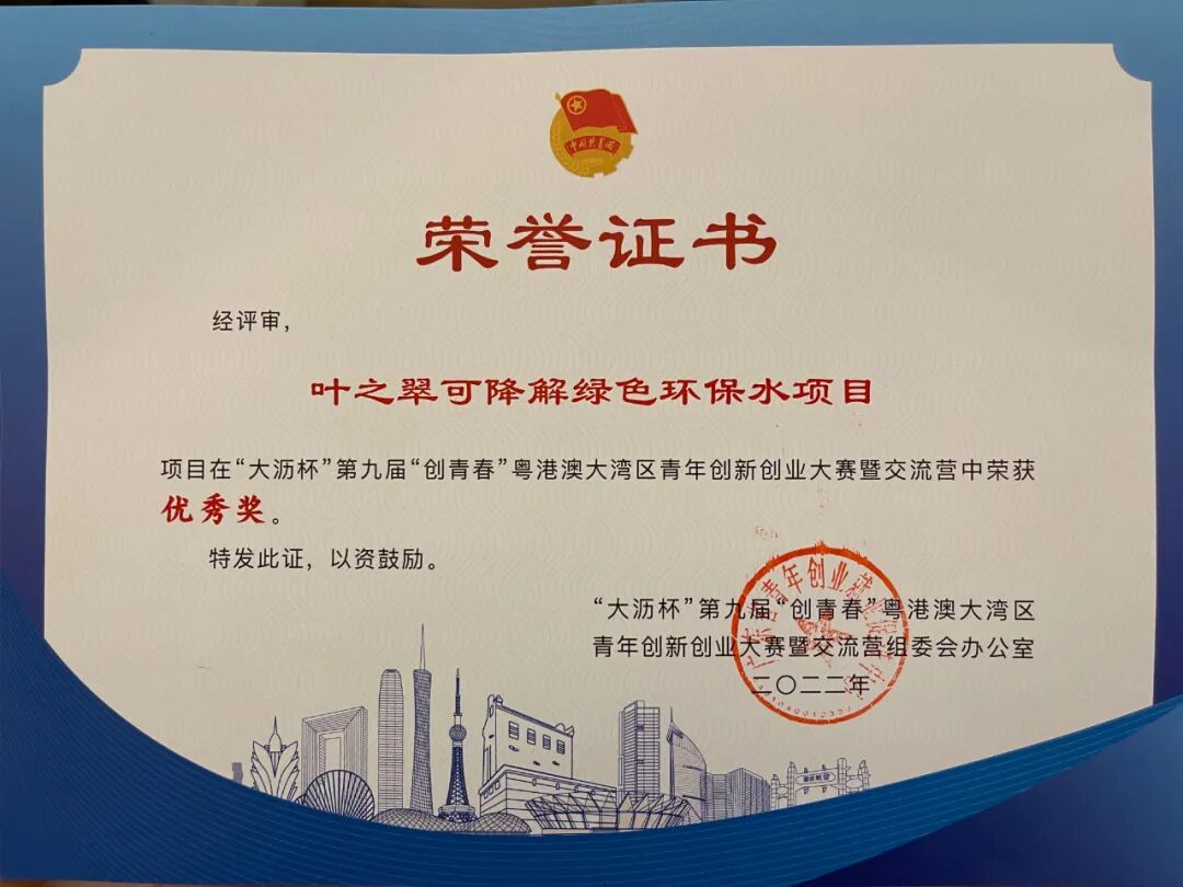 An award certificate of Tracy Yeung and her boyfriend's rural revitalization project at Dali Cup Guangdong-Hong Kong-Macao (GBA) Youth Innovation & Entrepreneurial Competition. 杨翠儿与男友所做的环保项目在“大沥杯”粤港澳大湾区青年创新创业大赛上获优秀奖。