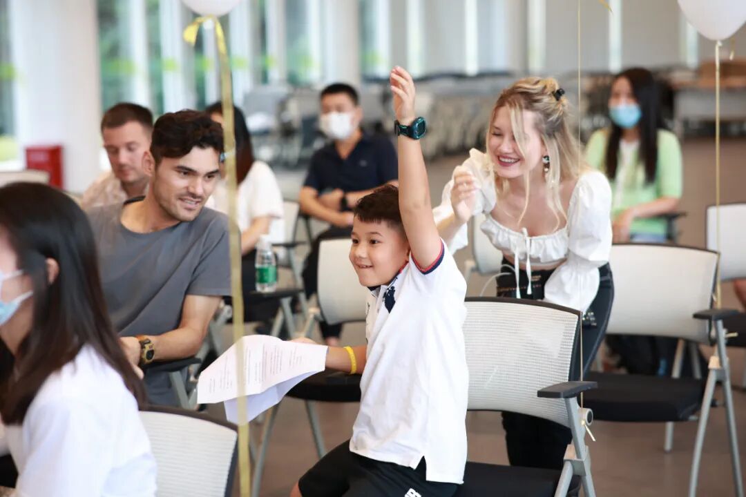 外籍小参观者David在知识竞赛环节举手回答问题。