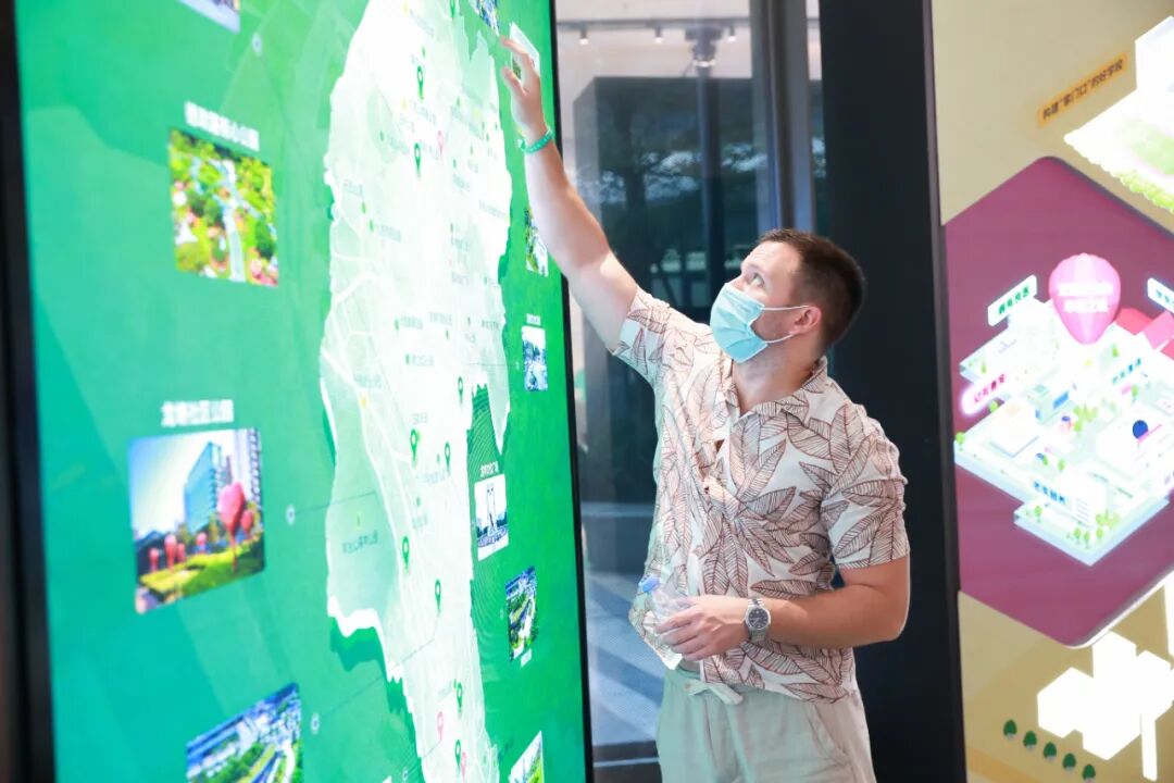 外籍居民在龙华城市客厅参观,并使用互动屏幕获取信息,观看3D电影了解龙华未来的智能城市场景。