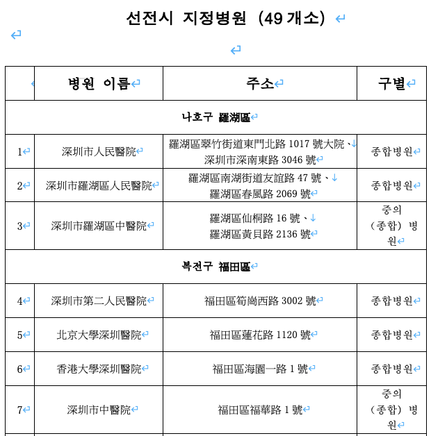 (1)즉시 지정 병원의 발열코너(선전시 49개소 발열 진료소 정보 첨부)에서 진료 받으십시오. 소아, 노인, 임산부, 기저 질병이 있는 분들은 더욱이 빨리 진료를 받으셔야 합니다.