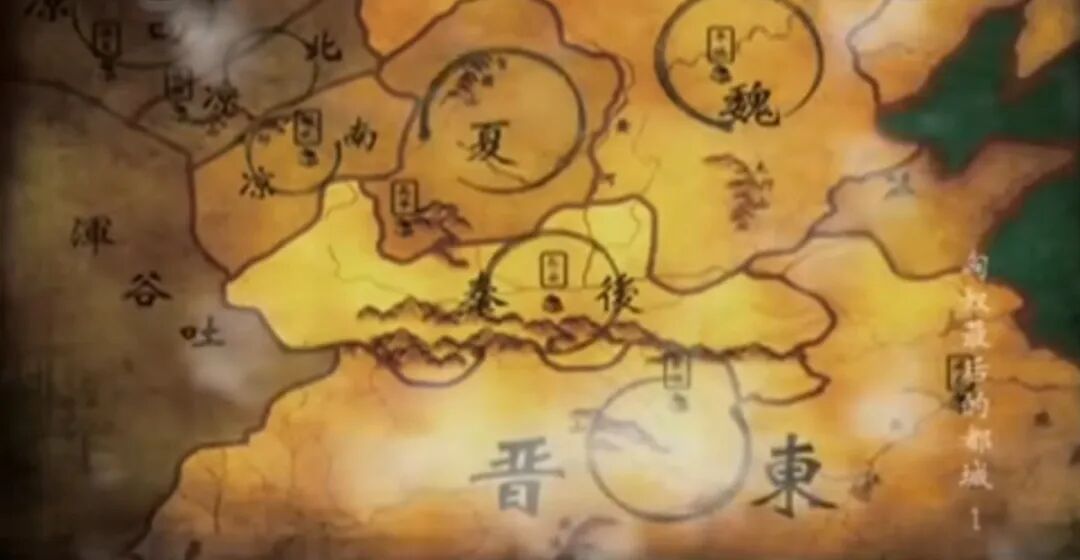 大夏国地理位置与十六国形势。来源/纪录片《匈奴最后的都城》截图