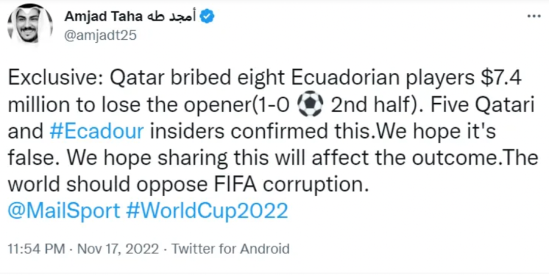 但是,卡塔尔仍属于世界足坛的新军,世人对其不熟悉,且因为石油国家的土豪气质,开赛前甚至在社交媒体疯传一条新闻,即卡塔尔尝试打假球:据英国中东研究中心主席兼记者Amjad Taha爆料,卡塔尔为获开门红,以740万美元的价码,贿赂了8名厄瓜多尔球员,而比分将是卡塔尔1-0厄瓜多尔(下半场进球)。该条新闻还有模有样地指出,5名卡塔尔和厄瓜多尔方面的知情人士确认了这一消息。揭幕战开场不久,厄瓜多尔队利用定位球,由老将瓦伦西亚打进一球,裁判在回看VAR后,认定越位,取消了这一进球,笔者在社交媒体上看到许多人嘲讽卡塔尔的“钞能力”,认为这球并不越位,裁判有帮助东道主的嫌疑,(当然通过慢动作回放与解说普及,确定了这个球是毫无疑问的越位)这其实仍反映出不少人对卡塔尔足球能力的质疑。![]()