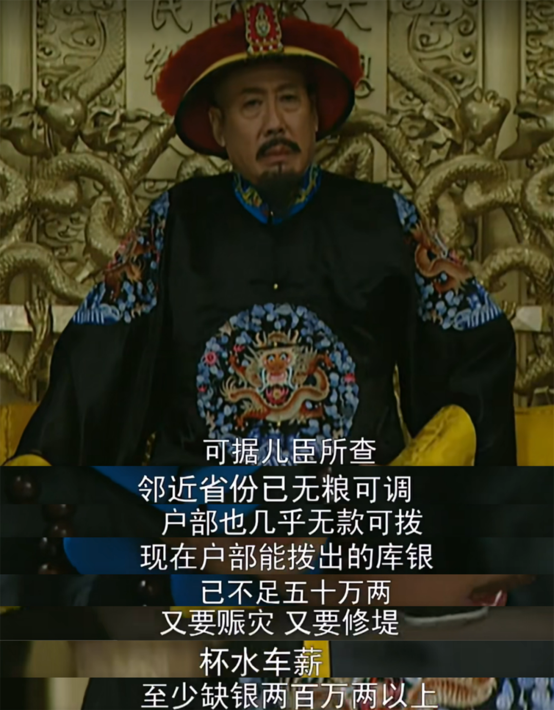 康熙朝后期,皇四子胤禛发现朝廷已无力赈灾。来源/电视剧《雍正王朝》截图