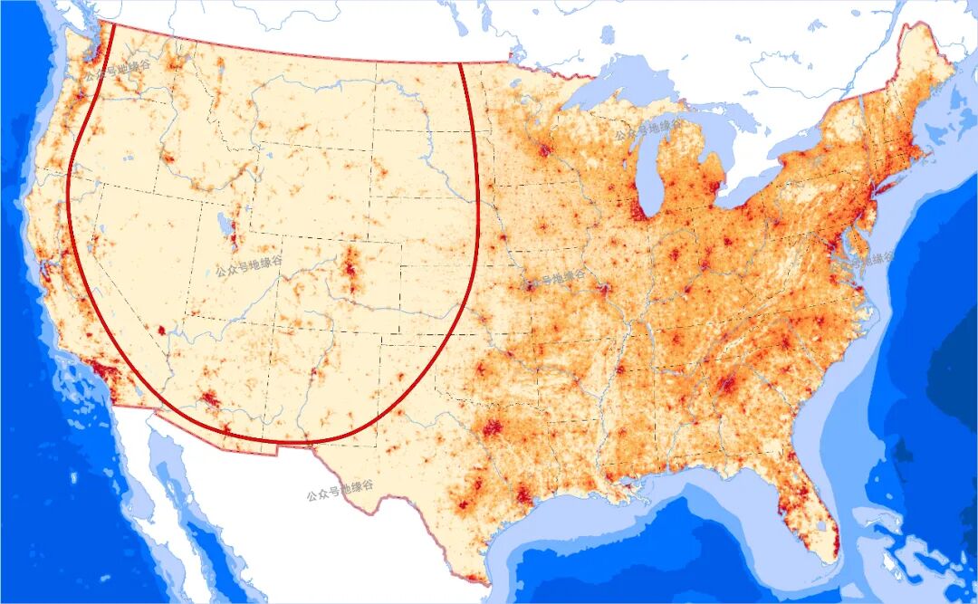 如上图所示,红线以内是人口稀疏区,以外是人口相对密集区。在辽阔的美洲大陆两岸,美国的人口集中分布于海岸地区,而中间的内陆则荒无人烟。洛杉矶一城的人口就相当于美国中西部的科罗拉多州、怀俄明州、南达科塔州、新墨西哥州几个州的人口总和,而后几个的面积加起来约莫是洛杉矶县面积的100倍。