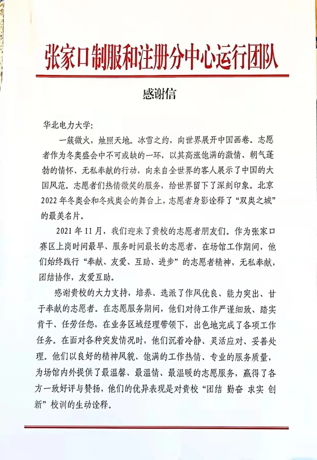 学校上下一心服务冬奥,受到主流媒体关注。除夕,延庆赛区志愿者接受央视连线,张家口赛区志愿者荣登央视春晚,向全国人民展现了华电风采。央视《新闻直播间》栏目播出我校本科生许可的“冬奥VLOG”,展现了我校志愿者充满热情与爱的专业服务。“探访冬奥志愿者之家岗位上过新年”、“华北电力大学志愿者出征冬奥”、“志愿点亮青春服务成就精彩”、“推迟的婚礼”等有关冬奥志愿者的精彩瞬间被央视、新华社、北京2022年冬奥会和冬残奥会组织委员会官网、中国青年网、河北日报等先后报道。学校紧紧围绕服务保障冬奥大局,汇聚青年智慧,营造冬奥浓厚氛围组织师生摄制《燃烧的雪花》MV,开设冬奥知识科普栏目,举办冬奥主题手工花灯创作展、冬奥主题井盖绘制活动,向广大师生讲述新时代北京故事、中国故事。注册业务领域志愿者自主研发信息海量数据比对方法、开设从专业角度分析冬奥各项赛事规则流程大讲堂、临时党支部在延庆冬奥展厅开展党课、在张家口赛区开设《奥运日常用语多语种教学科普》系列公益微课等活动获校内外一致好评,得到广泛报道。