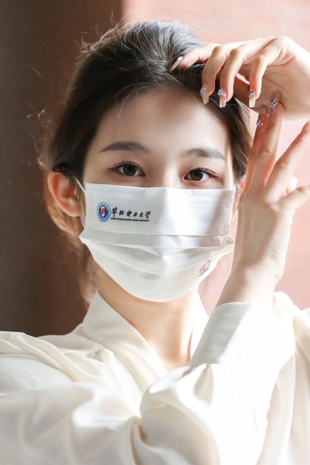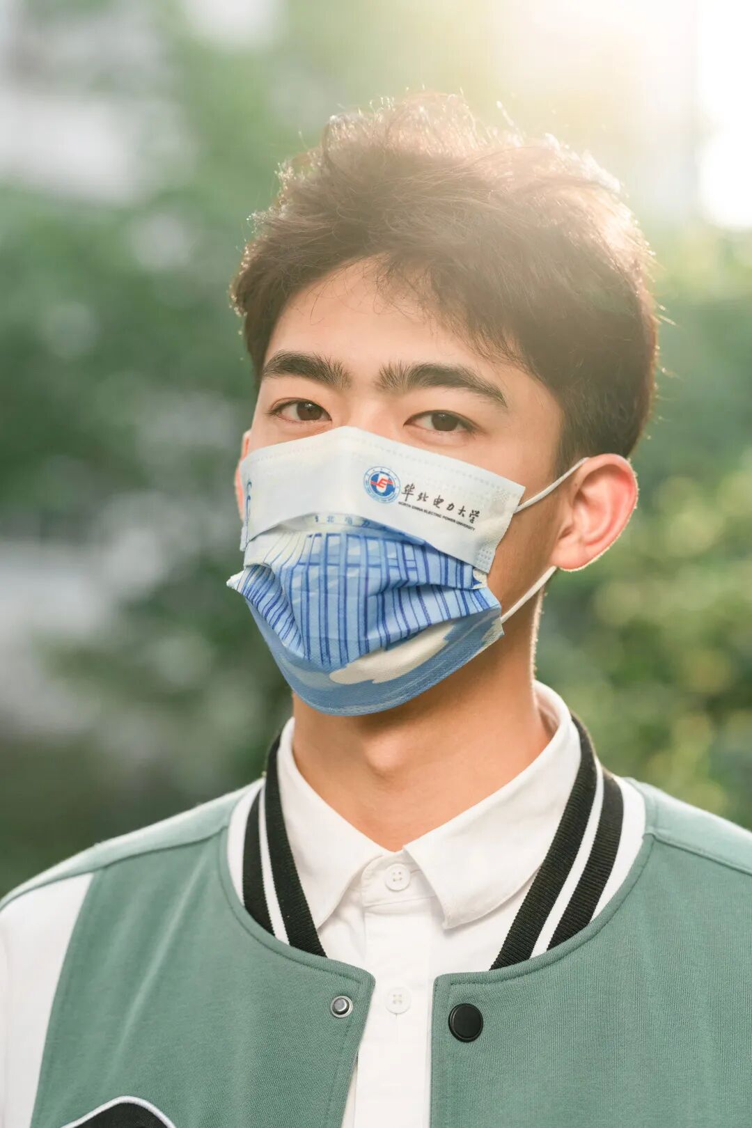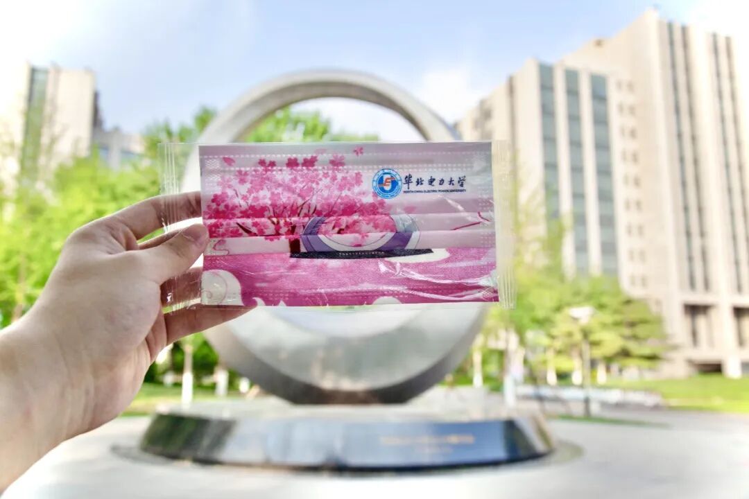 简约、大气、干净的白色口罩上,华电校标分外醒目,右下角是缩小版的主楼和建校六十周年主题雕塑彩绘。戴上它,你就是华电最靓的仔。
