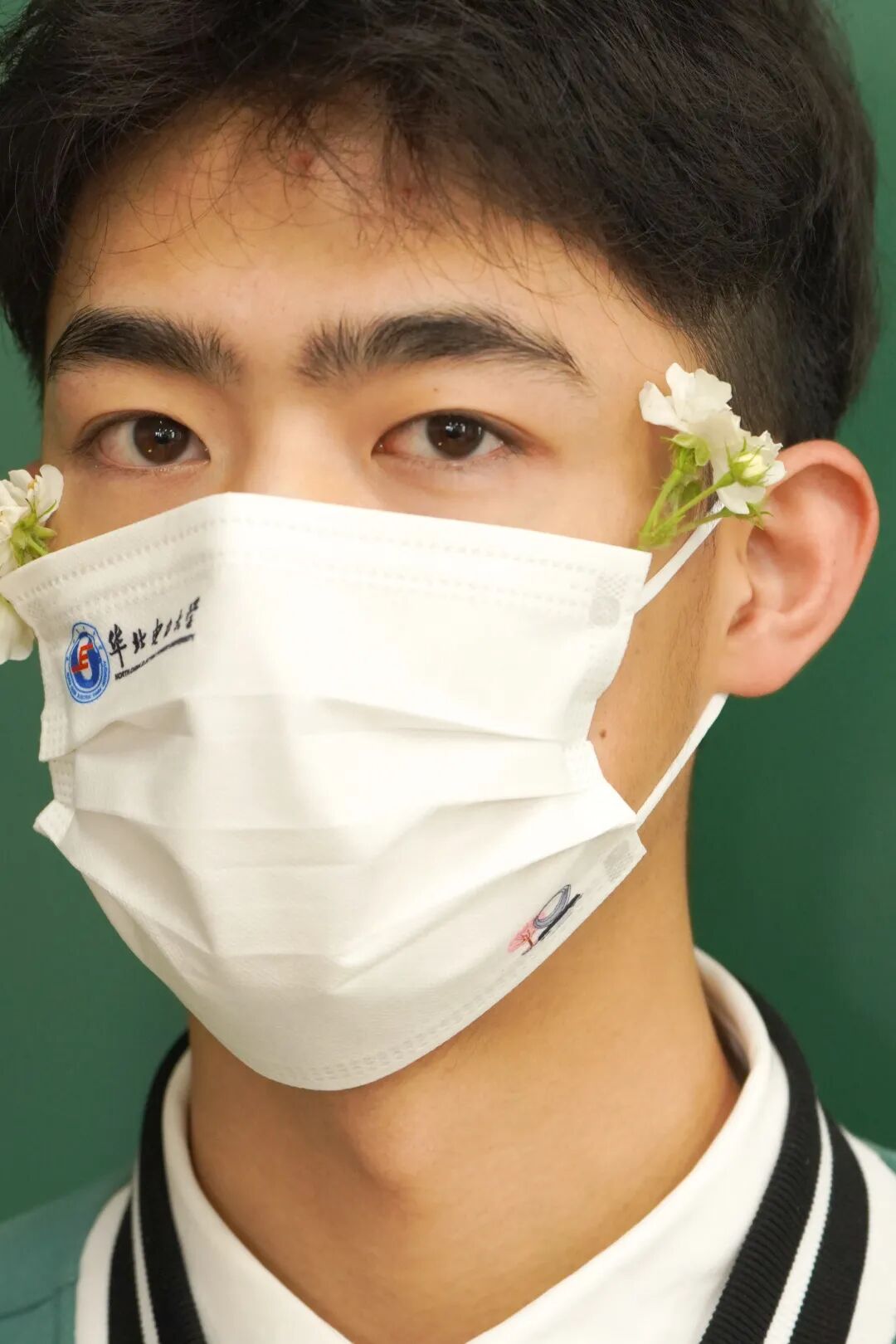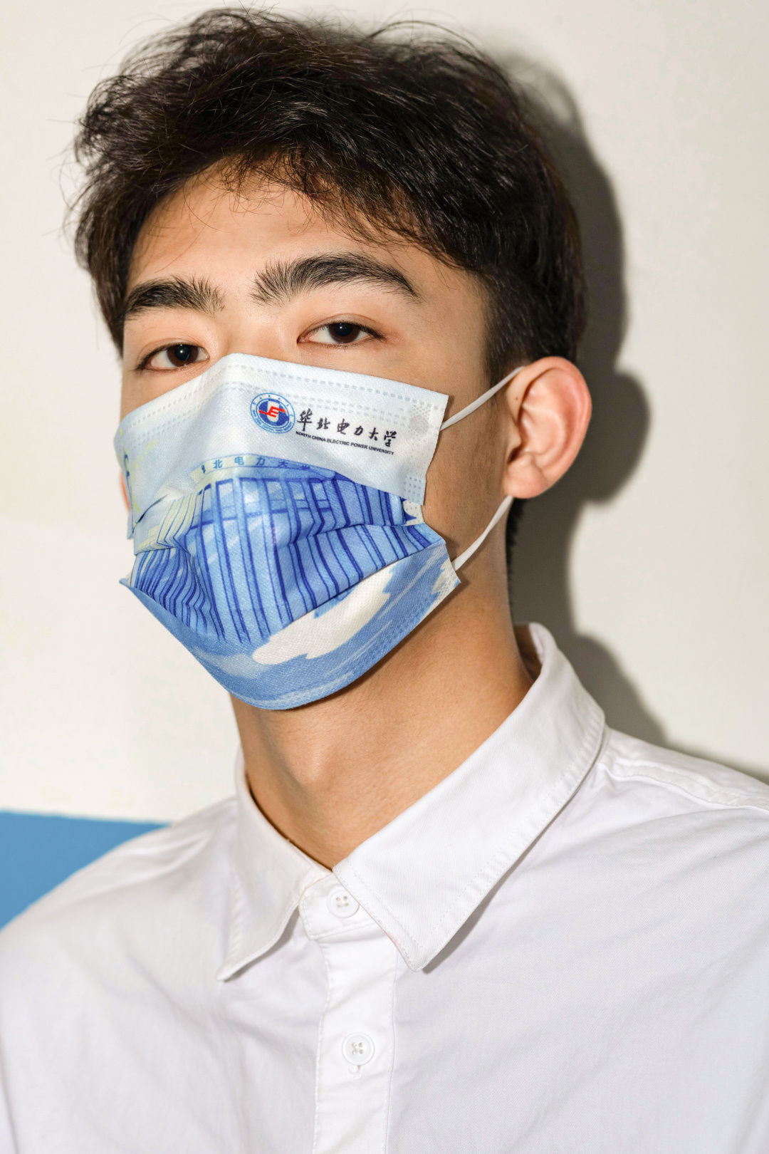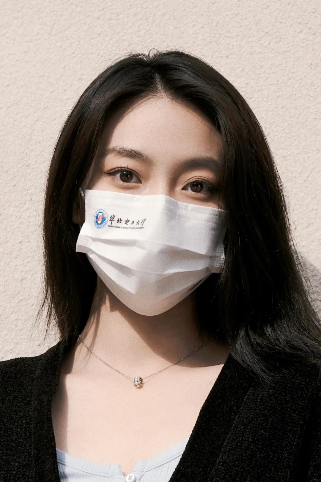 简约、大气、干净的白色口罩上,华电校标分外醒目,右下角是缩小版的主楼和建校六十周年主题雕塑彩绘。戴上它,你就是华电最靓的仔。