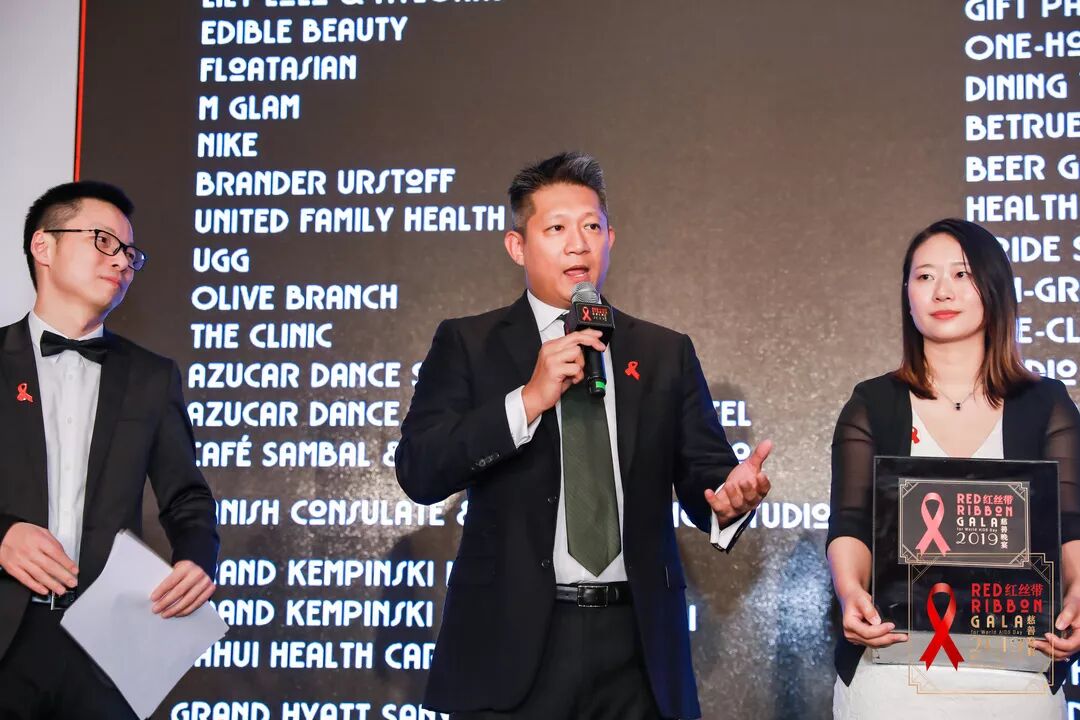 Shanghai Qingai representative Ben also gave a moving speech about finding his community at the health center. After contracting lung disease and being diagnosed with HIV, Ben went on to become the support group leader for individuals living with HIV, providing psychological counselling and emotional support. Red Ribbon Gala co-founder Henk Meyknecht gave a speech expressing his pride in the gala’s continued growth and honoring the life of his friend Franck Crouvezier, who organized Shanghai’s first HIV/AIDS awareness charity dinner back in 2005. Boyong Yuan of Bayer China spoke about the company’s commitment to workplace equality and diversity.