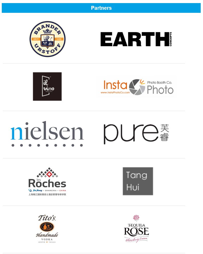 今年的合作伙伴包括Brander Urstoff、Earth Water、Il Vino、Instaphoto、尼尔森、芙睿传播、Les Roches、Tanghui、Tequila Rose及Tito’s Vodka。今年的企业支持包括:壹家公益人、Acrylic Mode、安达仕与朋友们、Design Union与嘉宾、Happy Unicorns、Henk与朋友们、嘉汇医疗、Joaquin与朋友们、Life Aligned与Jiaha Institute、Lucca390、Mr. Willis、Sigrid与朋友们、Simon与朋友们及华特迪士尼公司。今年有40多家包括酒店、餐饮、美容与健身及生活等领域的企业捐赠了120多份抽奖礼品。