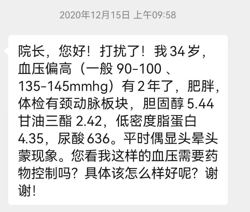 2020年,一位34岁的青年朋友因为自己有高血压、高血脂、高尿酸,并且肥胖,给我发微信咨询: