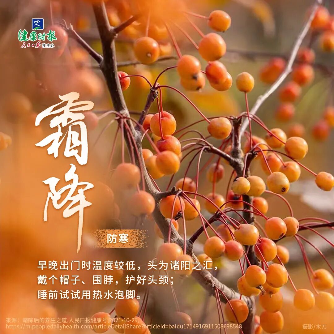 霜降时节是秋冬气候的转折点,也是阳气由收到藏的过渡,养生关键应注意做好“外御寒、内清热”。霜降节气过后,就不再适合“秋冻”了。