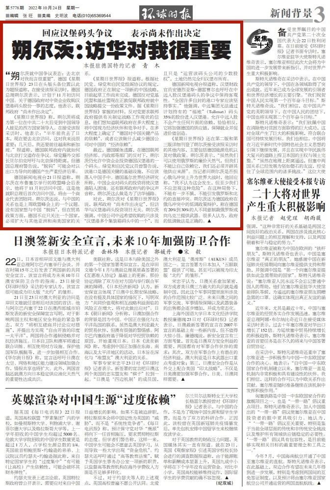 “朔尔茨就中国争议表态:去北京对我而言很重要”。德国《星期日世界报》23日在头版头条位置以此为题报道称,在接受该报采访时,德国总理朔尔茨表示,计划于11月初访问中国。关于德国政府对中资企业收购汉堡港码头股份一事的态度,他表示,联邦政府“尚未作出决定”。