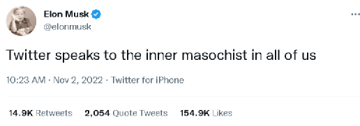 但他在此事发酵后的一则贴文中写下了这么一句话:“推特与我们所有人内心中的那个受虐狂产生了共鸣。”