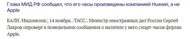 俄罗斯外交部发言人扎哈罗娃14日发布与俄外长拉夫罗夫在印尼巴厘岛的视频,辟谣西方媒体称拉夫罗夫住院的假新闻。而视频中,拉夫罗夫疑似佩戴苹果智能手表,使用苹果手机的画面又被一些西方媒体关注。塔斯社、《莫斯科共青团员报》、《俄罗斯报》等多家俄媒最新消息称,拉夫罗夫14日称,他戴的手表不是苹果制造的,而是华为制造的。