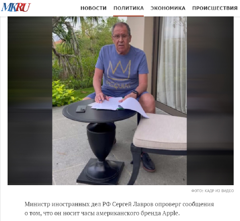 据《莫斯科共青团员报》报道,在扎哈罗娃发布视频后,有网友注意到他在视频中戴的手表,称这是苹果公司的产品。英国《太阳报》还特意提到,视频中的拉夫罗夫穿着短裤和T恤坐在户外露台上阅读文件,桌子上放着一部iPhone 14,手上戴着一块苹果手表,他的T恤衫上还印着一位美国艺术家的标志。