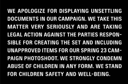 在第二则声明中,巴黎世家为“展示令人不安的文件”道歉,称他们会严肃对待此事,间接承认其广告中出现的文件确系相关案件摘录。